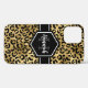 Chic gold and black leopard print iphone 12 pro case with a custom name and monogram template. A cute and trendy safari animal print pattern background topped with your own bit of personalisation.