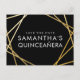 Modern, trendy, and elegant gold and black quinceanera save the date postcard with a unique abstract geometric squares border. Easily personalise this affordable save the date for your quince with custom name, date, and details of your fun and sophisticated celebration. All of the text is editable, so this design could easily be used for a birthday, sweet 16, or bat mitzvah save the date by changing the wording to suit your party.