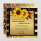 An elegant wedding invitation featuring two sunflowers on fall leaves with rose gold and gold floral swirls on a sparkling gold glitter and black striped background.