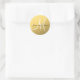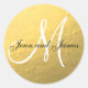 Gold Black Wedding Favour Sticker with bride and groom names and last name monogram initial. Also can be used for Wedding Invitation Envelope Seals. Fully customisable. Elke Clarke© for MonogramGallery at Zazzle. Other colours available in our store. Printed photo effect of gold foil in the background with white monogram and black script text. Perfect for a black and gold wedding theme.