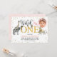 Cute wild one themed first birthday invitation featuring a black watercolor and faux gold heading and various watercolor safari animals. This design also features some faux gold foil dots around the edge of the invitation and a round area for a photo. This girl's safari first birthday invitation is ideal for a girl's wild one themed birthday party.