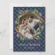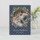 Elegant blue and gold custom watercolor photo Christmas cards with calligraphy title and featuring a geometric photo frame adorned with a botanical wreath. Easily personalise these blue buffalo plaid photo Christmas cards with your an image and a family name.