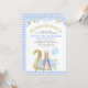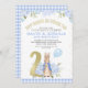 Sweet bunny themed second birthday invitation for a baby boy or boys featuring a cute Peter Rabbit illustration, various baby blue floral arrangements, and faux gold glitter dots and and faux gold foil number. The design also features a blue plaid pattern. The faux gold heading and number are removable. This design is ideal for someone having a Peter Rabbit themed birthday party.