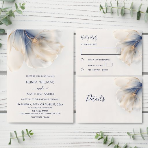 Gold Blue Smokey Flower Wedding RSVP Card