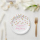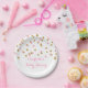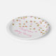 Customisable name girl baby shower party plates in light blush pink and gold confetti pattern and elegant hand lettered style text.