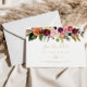 This gold boho floral horizontal wedding save the date is perfect for a rustic wedding. The design features hand-painted brown wild feathers, boho yellow, white, purple, pink, blush, burgundy flowers and blue berries neatly arranged into beautiful bouquets.