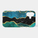 This pretty phone case features a dramatic abstract design in tones of blue, teal, gold and black. Tiny star confetti gives a sparkly effect, with your monogram in dark blue against lighter blue at the bottom left. Stunning!