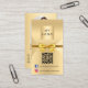 A faux gold looking background. Decorated with arch shapes and a golden bown. Personalise and add your business logo, photo, name, title and contact information. Add your website url/link to the Qr code. With Facebook and Instagram icons. Black text.