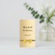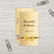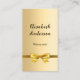 A faux gold looking background. Decorated with a golden bow. Personalise and add your name, title and contact information. Add your website url/link to the Qr code. With Facebook and Instagram icons. Black text.