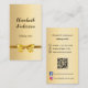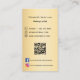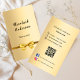 A faux gold looking background. Decorated with a golden bow. Personalise and add your name, title and contact information. Add your website url/link to the Qr code. With Facebook and Instagram icons. Black text.