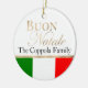 This festive ornament feature an Italian Christmas theme. The phrase, "Buon Natale" is printed across the top portion in an elegant gold style font. Buon Natale is Italian for "Merry Christmas." An image of the flag of Italy is printed across the bottom. A custom family name is printed across the centre of the ornament which you can personalise to include your own custom family name or text of your choice.