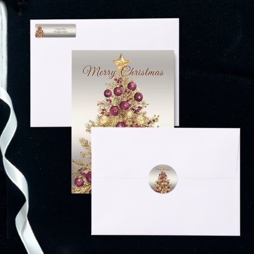 Beautiful Gold Burgundy Christmas Tree Holiday Paper Coaster