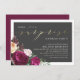 Elegant, floral surprise birthday party invitation featuring chic gold script calligraphy against a dark grey overlay with an arrangement of beautiful burgundy and cream peonies in one corner. Your details appear in simple, stylish typography. Click on "Personalise this template" to change the wording. Scroll down to "Customise further" to format the style or placement of the text. View the collection link on this page for matching products. Visit our store for more designs!