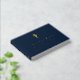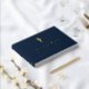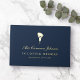 Navy blue funeral guestbook with gold foil text and a gold foil calla lily on the cover. The spine text is also printed in gold foil.