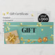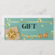 Festive glamourous high quality holiday design featuring luxury gold gift box, bow and ribbon with golden stars and Christmas tree ball on a simple plain pastel mint green teal background. This elegant and modern gift certificate is perfect for your small business or to gift friends and family, especially for Christmas holiday time.