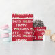 Happy Holidays text with gold foil Christmas bow on red background with snowflakes.