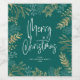 This wine bottle label features a beautiful border of gold greenery on a dark teal background. The message "Merry Christmas" is a trendy handwritten style text. Personalise this holiday label with your name.