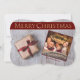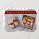 A modern Christian Christmas card design with your family photo and names next to a gold wrapped Christmas gift with Christmas red ribbon. Sparkling gold Merry Christmas text in a red banner along the top.