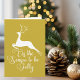 An elegant white reindeer leaps on a beautiful gold holiday card with the beautiful Christmas song lyric Tis The Season To Be Jolly in sophisticated calligraphy. Customise the inside with your own custom message.