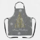 Bring seasonal elegance to your kitchen with this Gold Christmas Tree and Snowflakes Apron. Showcasing a classic Christmas tree illustrated with fancy flourishes and adorned with delicate white snowflakes, the design rests on a soft grey background for a timeless winter theme. A graceful Merry Christmas message in elegant script enhances the simple layout, making this apron a stylish choice for cooking, baking, or hosting. Perfect as holiday kitchen gifts or as a festive accent for your own holiday traditions.