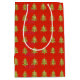 Celebrate the holidays in style with this red gift bag featuring a repeating gold Christmas tree print. Perfect for wrapping presents or using as festive décor, this sturdy, eye-catching bag is sure to make a lasting impression at any celebration.