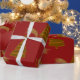 This red and gold Christmas wrap features a contemporary pattern of funky, gold Christmas trees surrounded by golden swirls that are similar to  snow flurries. This bright and modern Christmas paper will look great wrapped around your favourite people's presents!