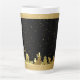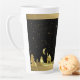 Black and metallic gold tones Christmas village with Santa, snowman Christmas moon all with gold tones sparkles.