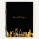 A black background, with a faux gold city skyline as decor. Template for your name, golden letters. The name is written with a modern and trendy hand lettered script.