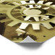 A golden mechanical collection of cogs and gears from inside a clockwork assembly.