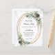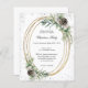 A white background. An oval faux gold frame decorated with cones, white berres and pine greenery. Faux silver glitter, sparkles. Personalise and add the details. Black text.