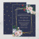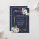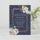 Stunning wedding invitation done in navy blue, with graphics of a double skewed gold framed text area decorated with pastel flowers and gold confetti dots, around the outside. Personalise the text to suit your wedding needs. Matching products are available.