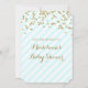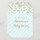 Personalised baby shower invitations with gold confetti pattern and light pastel sky blue and white stripes with handwritten style lettering. Customisable with your text.