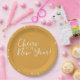 stylish and fun, these paper plates are perfect for your New Year's Eve party celebration. The design features white confetti on a gold background, and the text "Cheers to the New Year!"