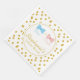 Gold confetti gender reveal paper napkins. The design features a confetti pattern and a white circle in the middle with a blue bow tie and a pink bow with your custom text.