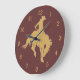 This wall clock features what everyone knows about Wyoming. Horses buck and cowboys ride 'em! It features a gold cowboy and bucking horse silhouette image on a dark brown background. The gold numbers make it easy to read. *This design uses image © Graphics Factory.com*