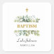 This image displays a beautifully designed baptism Square Sticker. The top of the design features a simple, elegant cross symbol, indicative of the Christian significance of the event. Below the cross is a lush arrangement of watercolor greenery, with various shades of green leaves that add a fresh and natural touch to the design. The text is thoughtfully laid out with a mix of classic and modern fonts, emphasizing an elegant baptism ceremony. The name of the child is featured prominently, indicating the child to be baptised.