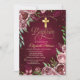 Elegant gold cross, burgundy roses, and confetti on a red background.