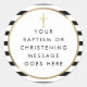 Chic black and white stripe baptism or christening sticker featuring a gold cross with an elegant faux gold foil border that frames your special celebration event message set in modern typography. Designed by Thisisnotme©