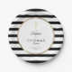 Classic black and white stripe baptism or christening paper plate featuring a gold cross with an elegant faux gold foil border that frames your special celebration event details set in modern typography. Designed by Thisisnotme©