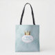 All purpose beauty pageant tote bag done in a turquoise blue satin look. A white oval text area, on the front of the bag, has graphics of faux diamonds as a frame and a gold crown, on top. Personalise the text to suit your needs.