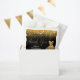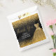 A beautiful gold themed elegant watercolor dress gown on a black background with faux glitter at the top and bottom of the favour bag.