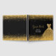 A beautiful gold themed elegant watercolor dress gown on a black background with faux glitter at the top and bottom of the guest book.