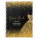 A beautiful gold themed elegant watercolor dress gown on a black background with faux glitter at the top and bottom of the guest book.
