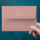 Simple, elegant, modern dusty rose wedding 5x7 envelope with adorable unique gold butterfly - symbol of spiritual rebirth, hope, and life, return address and monogram at the top back.