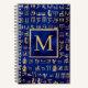 This cool and unique custom journal features an ancient Egyptian art theme. A pattern of gold hieroglyphics are printed on a blue textured background. A sample monogram initial is placed in the centre of a gold frame.