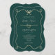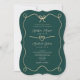 Elegant and romantic bracket-shaped wedding invitation featuring a deep emerald green background with a faux gold rope border and heart detail. Accented with a bow at the top and soft calligraphy script, this formal design is perfect for fall, winter, or sophisticated evening weddings. Ideal for couples seeking a classic look with a modern twist. Personalise with your names, wedding details, and reception info to create a timeless first impression.