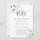 This 60th birthday party invitation features painted watercolor eucalyptus and green leaves with botanical gold numbers.