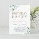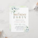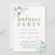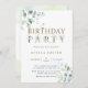 This birthday party invitation features painted watercolor eucalyptus and green leaves with botanical gold letters.