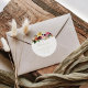This gold feather boho floral minimalist thank you wedding favour classic round sticker is perfect for a rustic wedding. The design features hand-painted brown wild feathers, boho yellow, white, purple, pink, blush, burgundy flowers and blue berries neatly arranged into beautiful bouquets.