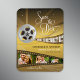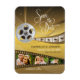 A glamorous cinema-themed save the date featuring a dramatic gold Hollywood background with a vintage film reel, a heart-adorned film strip, and three custom photo slots for your favorite engagement shots. Searchlight rays and star details complete the red-carpet atmosphere. All names, date, location, and photo panels are fully customizable.